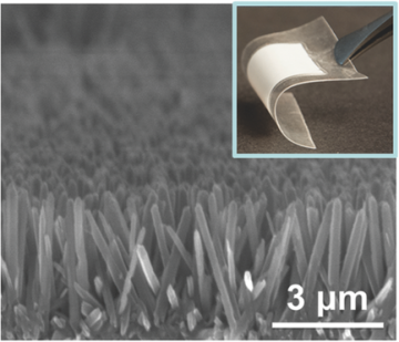 The titanium dioxide nanowires are grown on fluorinedoped tin oxide coated glass. A template ensured all the nanowires grow perpendicular to the glass surface, and to the same uniform height. Barium and strontium ions are infused into them during the process. A nanosheet of silver applied to the array serves as an electrode. The resulting material can be applied to a flexible surface, including clothing, using a sticky tape, they said.